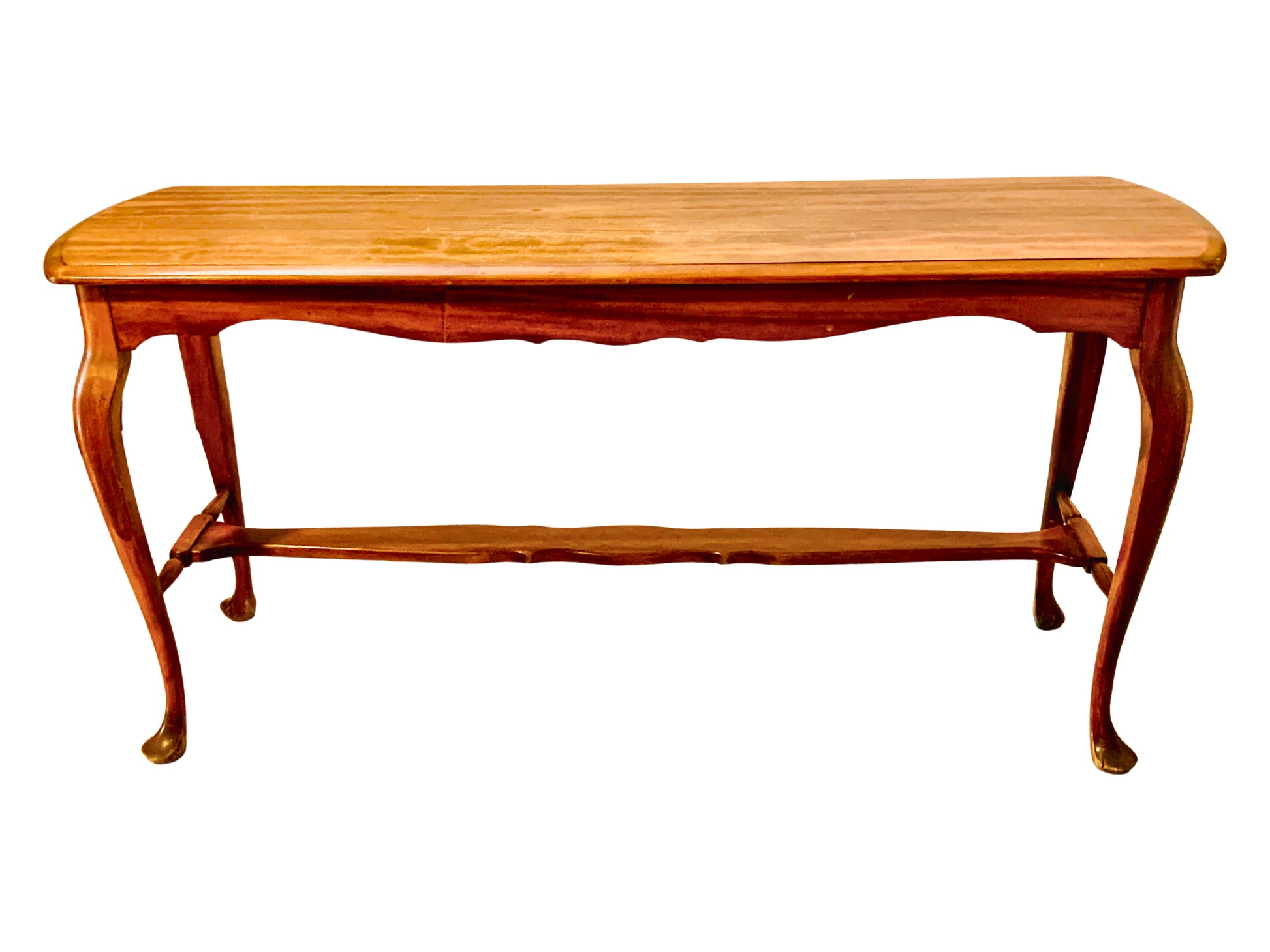 Elegante consola de recibidor en estilo Provenzal Francés, elaborada en fino cedro rojo. Este mueble versátil presenta un diseño sofisticado con un tablero rectangular de 151 cm de longitud, 46 cm de profundidad y 74 cm de altura. El tablero superior cuenta con esquinas bellamente redondeadas y una delicada cenefa perimetral calada que añade un toque de distinción. Las características patas Cabriolé, típicas del estilo de 1715, están magistralmente labradas y conectadas por un travesaño que aporta estabilidad adicional. El bastidor está construido con ensambles precisos y faldones torneados que complementan la estética general. Con una capacidad de carga de 30 kg, esta consola combina funcionalidad con elegancia clásica. Sus acabados en tono marrón claro realzan la belleza natural de la madera, convirtiéndola en una pieza perfecta para vestíbulos, pasillos o cualquier espacio que requiera un toque de refinamiento francés campestre.