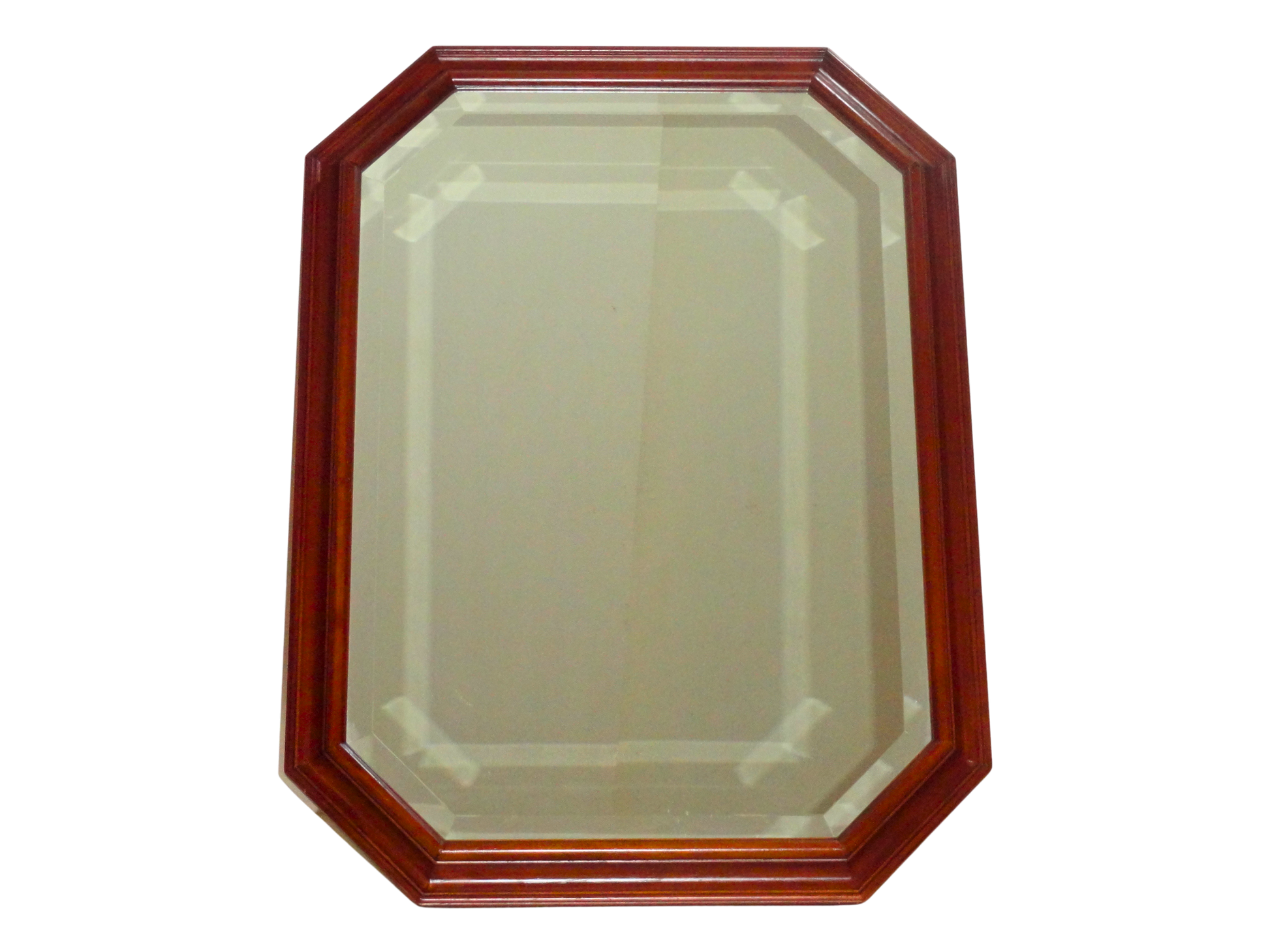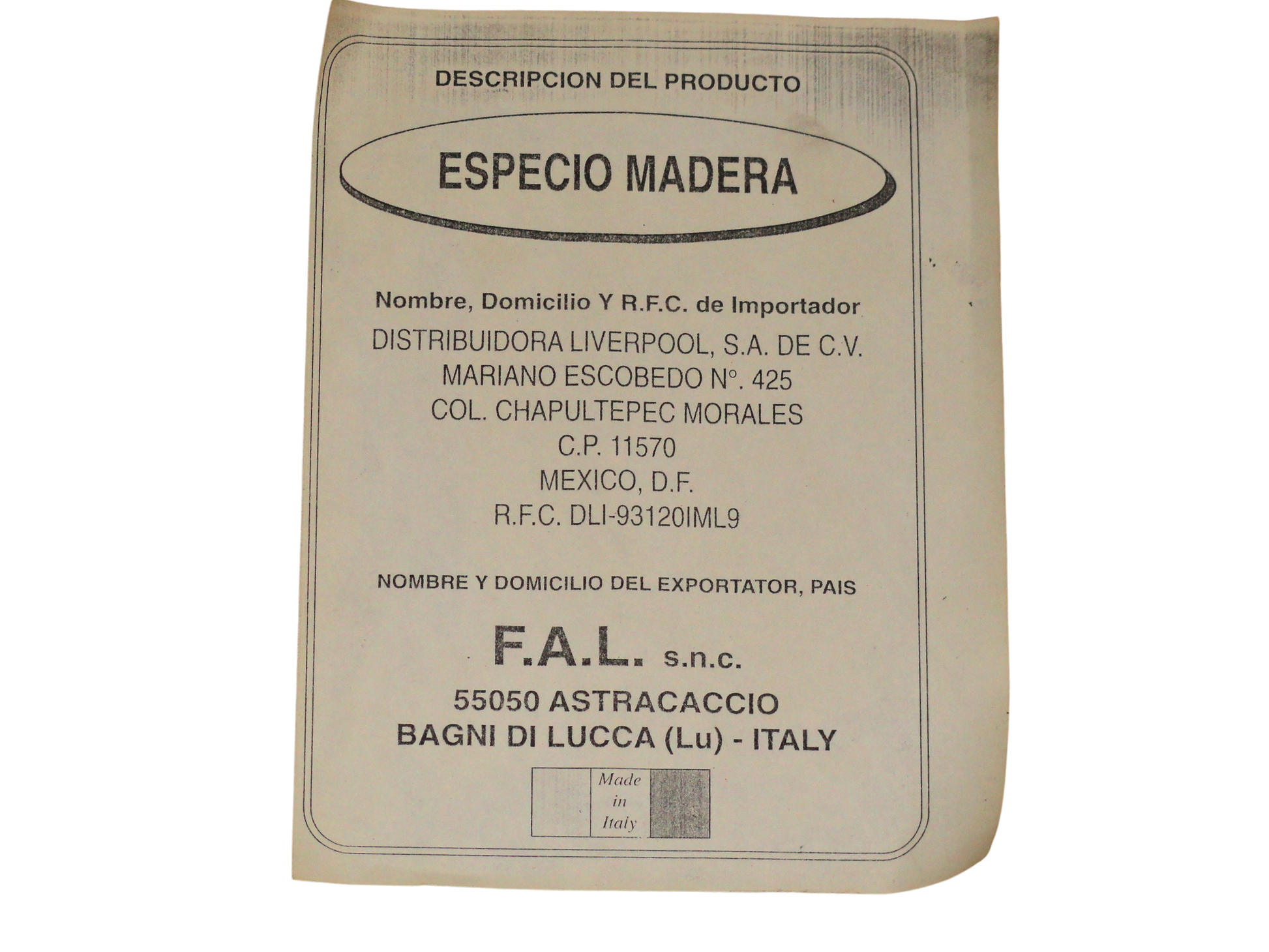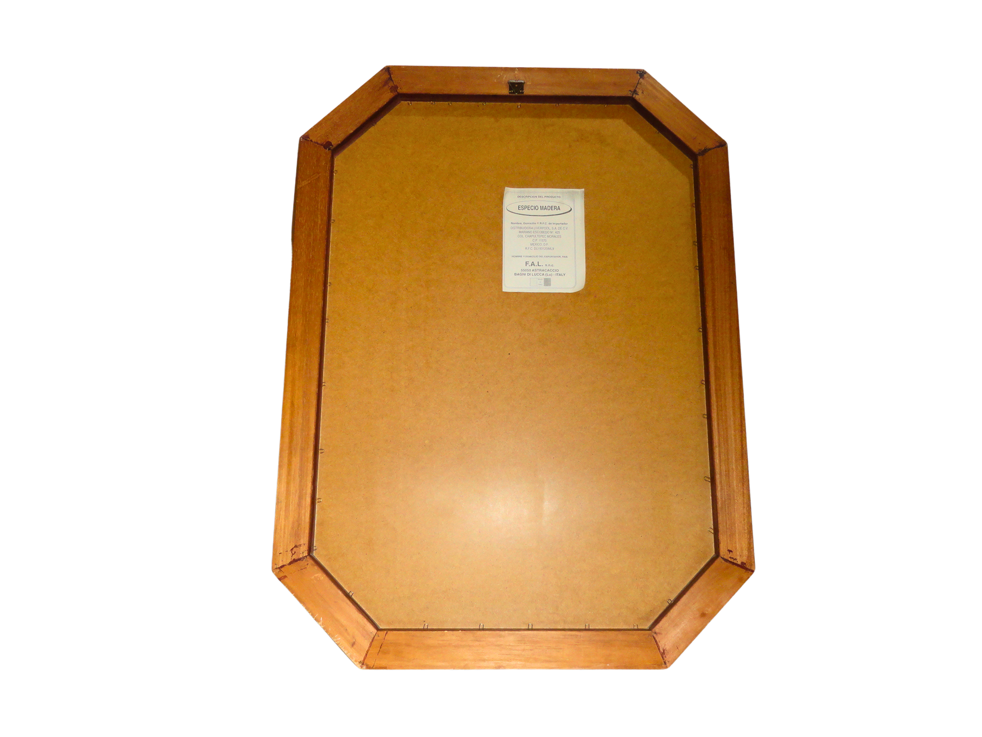 Espejo con un Marco Octogonal de figura geométrica de ocho lado, Su orientación vertical es más alta que ancha, fabricado con un marco de Madera Maciza de Nogal, con un acabado oscuro y brillante. El marco es grueso y presenta un diseño de capas con un borde interior biselado. El cristal central es de forma rectangular y está rodeado por un biselado de cristal interior que sigue la forma octagonal del marco de madera. Esto le otorga una mayor profundidad y un toque clásico o vintage, lo que añade un toque de elegancia y estilo, y es una pieza decorativa que complementa la decoración de interiores de estilo Neoclásico, que aporta un toque de calidez y distinción a cualquier estancia, como un vestíbulo, un dormitorio o un salón. Puede complementar decoraciones elegantes o rústicas. Los espejos planos reflejan la luz de manera regular, lo que permite obtener una imagen clara y sin distorsiones. Cuenta con un ojillo de colgado vertical. Made in Italy, exportado por F.A.L. s.n.c. 55050 Astracaccio Bagni di Lucca (Lu) - Italia, comercializado en México por Distribuidora Liverpool S.A de C.V.