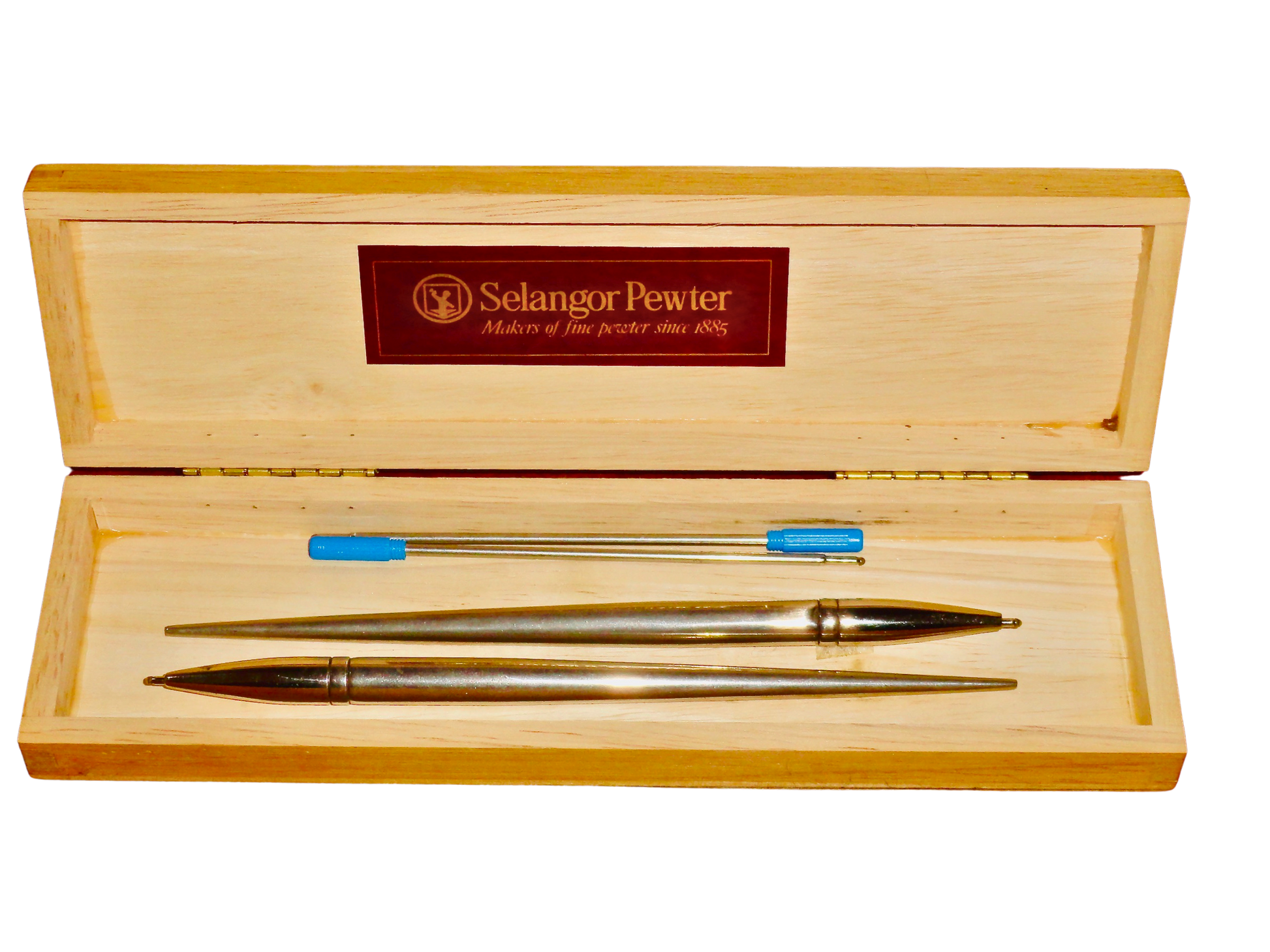 Incluye: 4 recambios de bolígrafos para Cross tinta azul nuevos. Se entrega en caja de madera Selangor Pewter.
