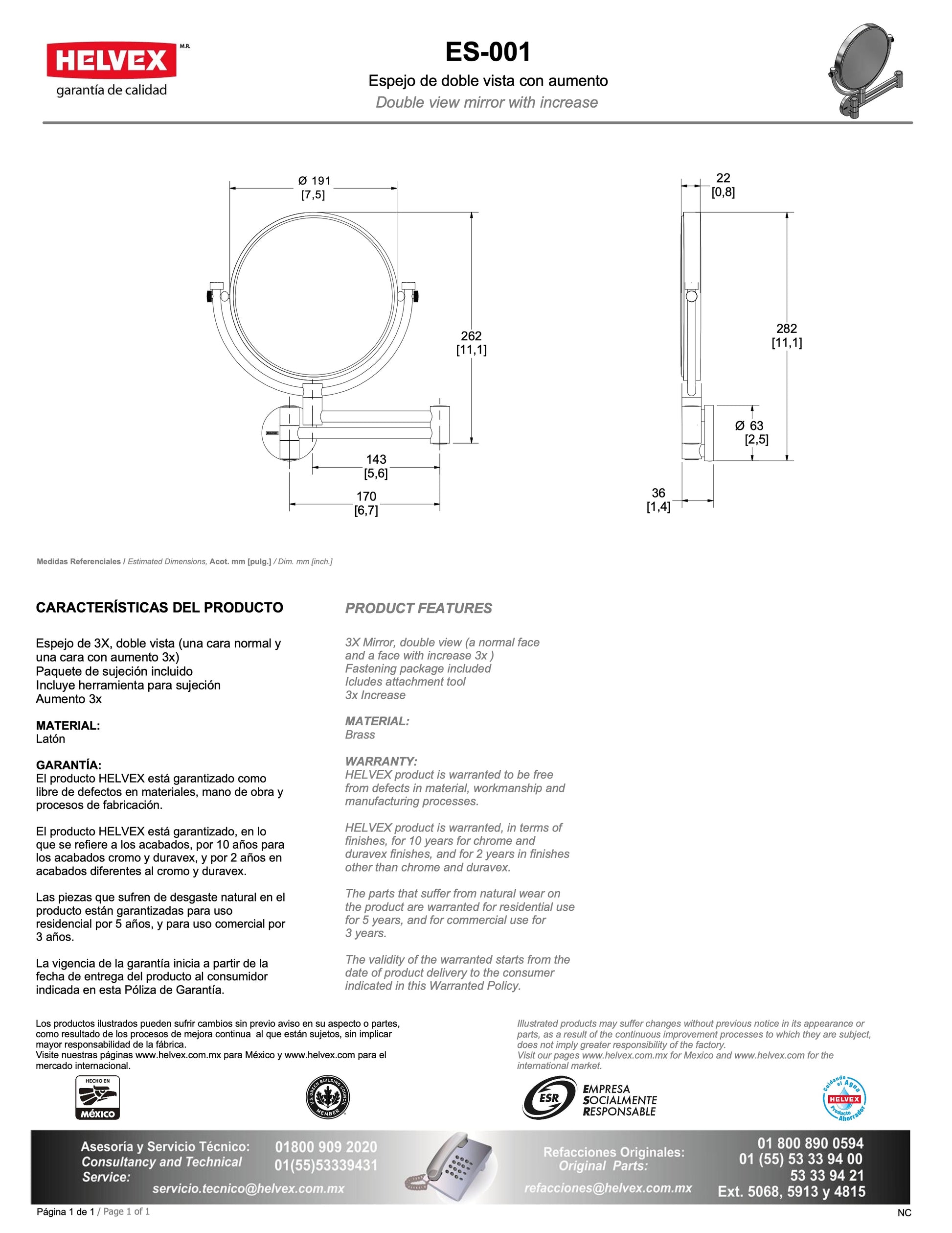 El espejo redondo Helvex ES-001 es la elección perfecta para quienes buscan infundir un aire de modernidad y sofisticación en sus espacios. Con un diámetro de 26.2 cm, su diseño compacto y elegante se adapta con facilidad a cualquier baño o dormitorio, convirtiéndose en un elemento decorativo esencial que realza la estética del ambiente. Su acabado cromado y estructura en latón cromado no solo aportan un brillo refinado, sino que también garantizan una durabilidad excepcional, reflejando la calidad y el cuidado en cada detalle. Este espejo, que no incorpora iluminación propia, aprovecha la luz natural para ofrecer un reflejo nítido y claro, ideal para el cuidado personal diario. Su peso de 2.5 kg facilita una instalación segura y sencilla en la pared, asegurando estabilidad sin comprometer la elegancia. La forma circular del espejo añade un toque de suavidad y equilibrio visual, complementando armoniosamente una amplia gama de estilos decorativos, desde el minimalismo más puro hasta ambientes contemporáneos y sofisticados. Más allá de su función práctica, el Helvex ES-001 se convierte en un verdadero objeto de diseño que aporta carácter y distinción a cualquier espacio. Su fabricación en México durante el siglo XXI refleja un compromiso con la excelencia y la innovación en el diseño de interiores. La reconocida calidad de Helvex asegura un producto resistente y duradero que no solo embellece el entorno, sino que también se convierte en un aliado indispensable en la rutina diaria, fusionando funcionalidad y estilo con una elegancia atemporal.