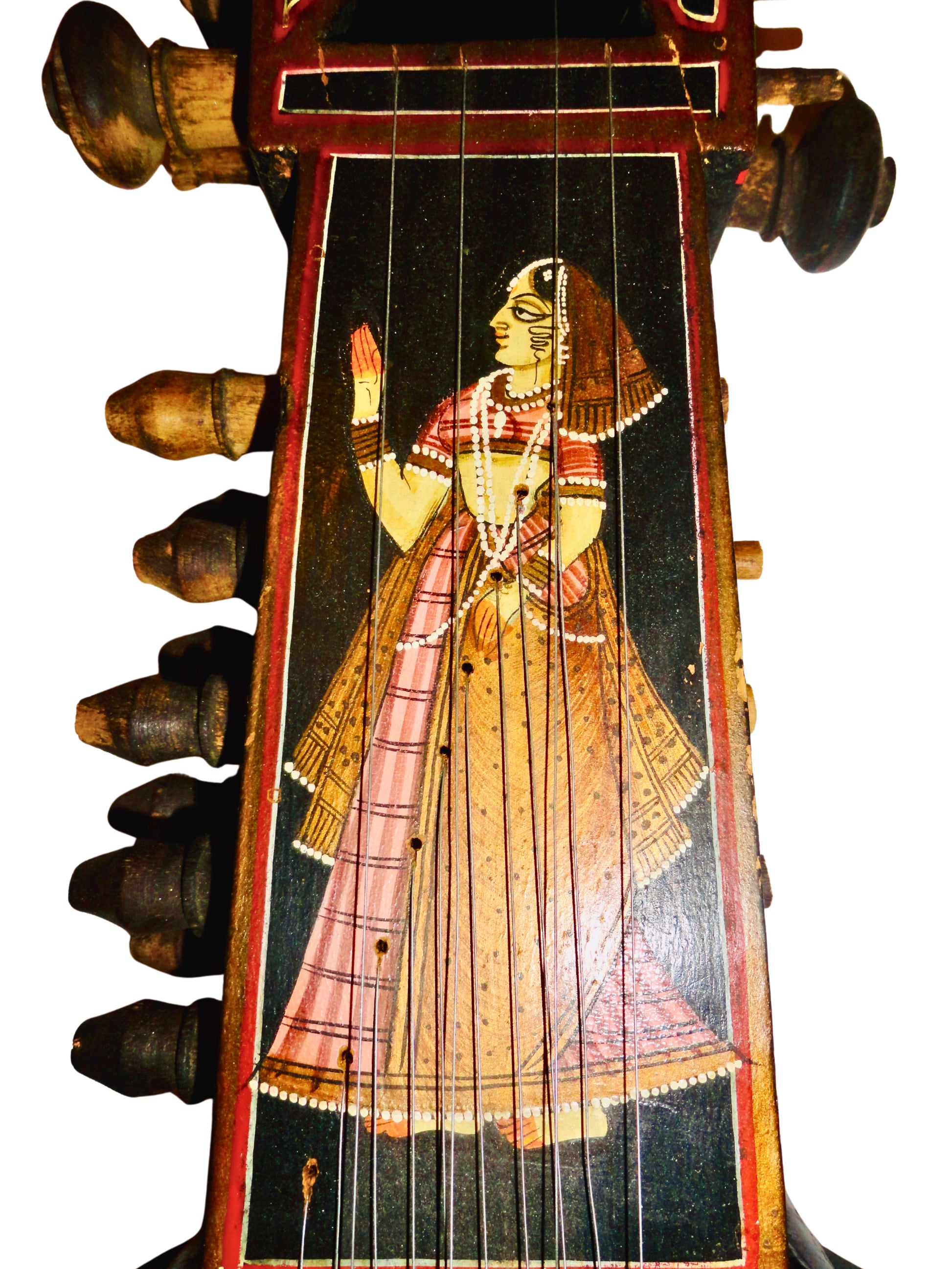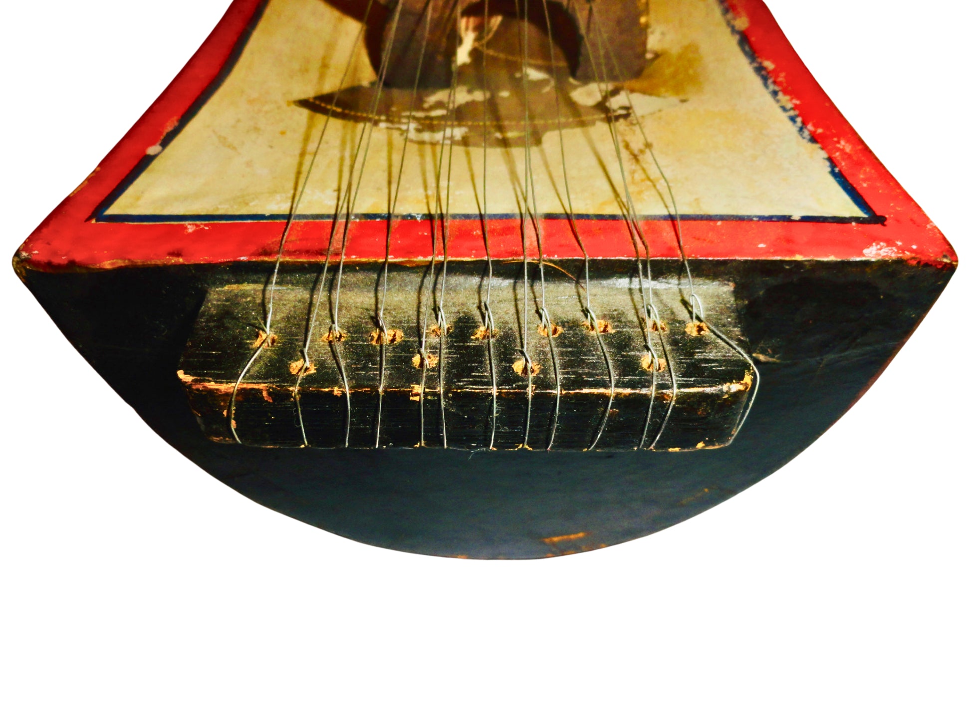 Descubre la magia musical del Sarangi, un fascinante instrumento de cuerda tradicional del antiguo Hindustán. Esta pieza vintage es una auténtica obra maestra artesanal que combina la belleza visual con la rica herencia musical de la India. El instrumento está exquisitamente decorado con pinturas tradicionales que representan figuras clásicas de la cultura hindú, realzadas por detalles ornamentales en tonos rojos y dorados. La caja de resonancia presenta una elaborada decoración pictórica sobre fondo claro, mientras que el mástil exhibe hermosos motivos decorativos y clavijas tradicionales de madera. Este Sarangi no es solo un instrumento musical, sino también una pieza de arte que refleja la sofisticación de la música clásica india. Sus cuerdas y construcción artesanal permiten producir los característicos sonidos melódicos que han cautivado a oyentes durante generaciones. Un elemento excepcional para coleccionistas de instrumentos musicales étnicos o amantes de la cultura tradicional india.