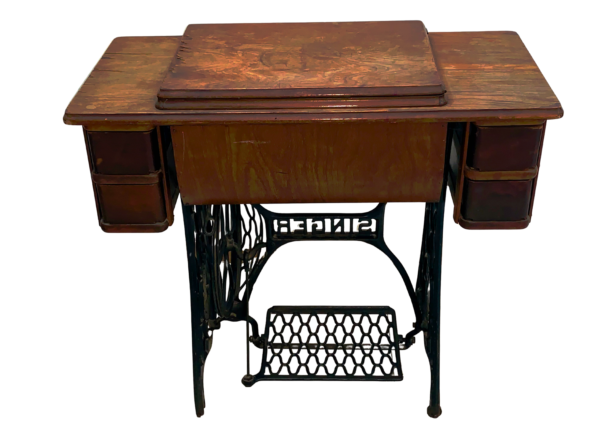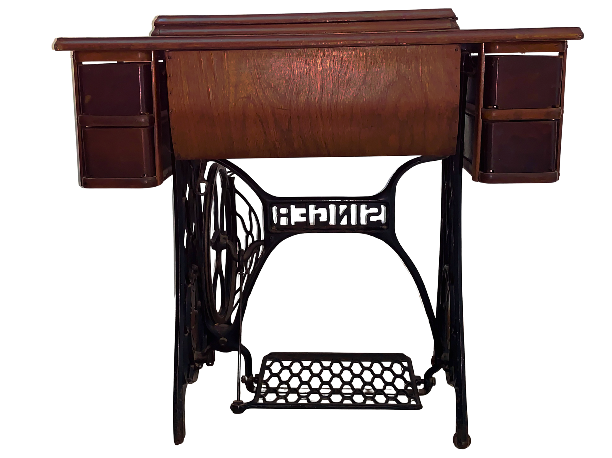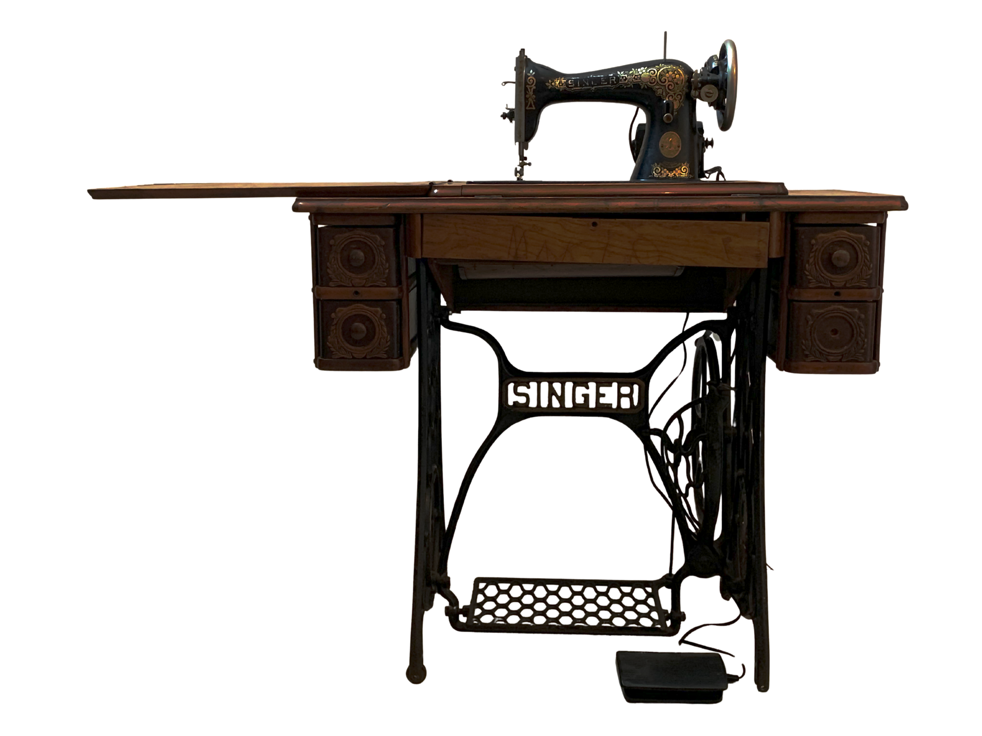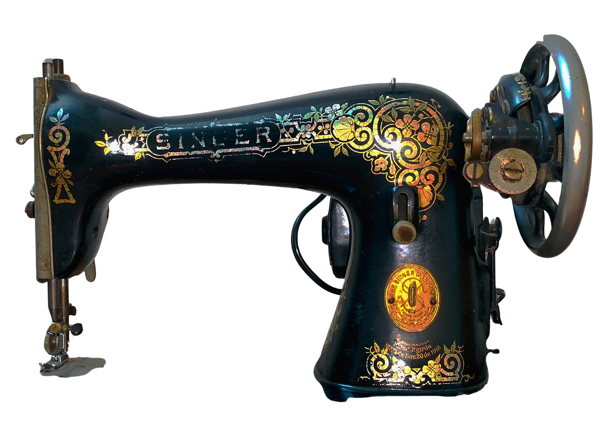 Singer, Maquina de Coser, Negro y Marrón, Hierro Fundido y Nogal, USA, 86 cm A x 41 cm P x 77 cm H, 40 - 45 kg. aproximadamente.