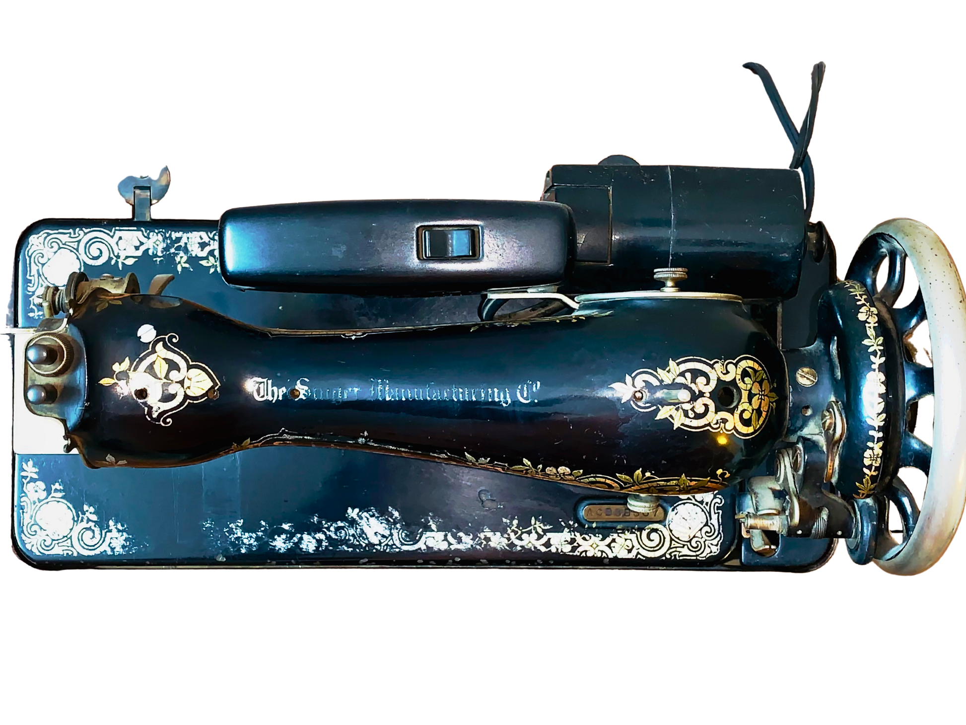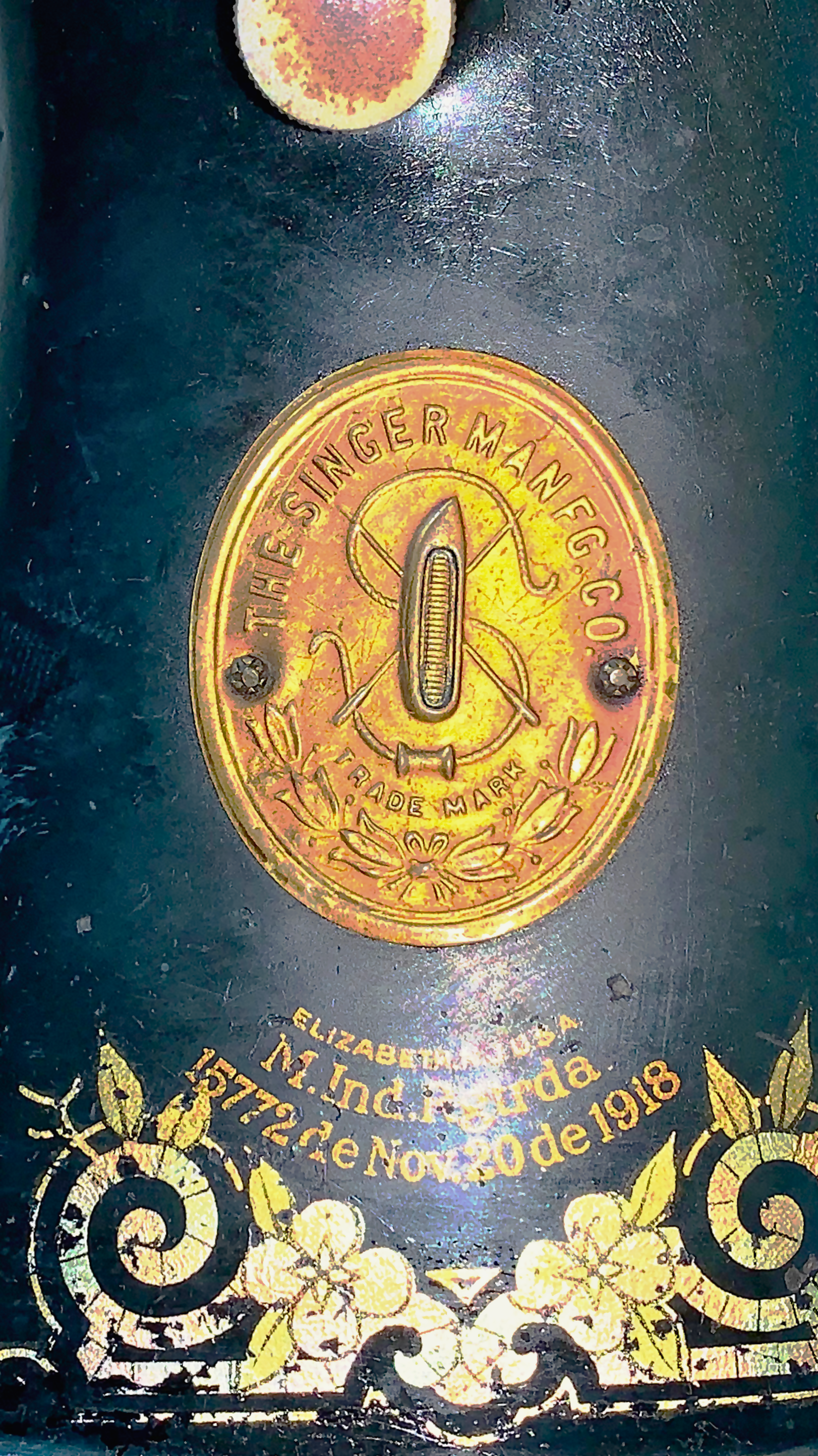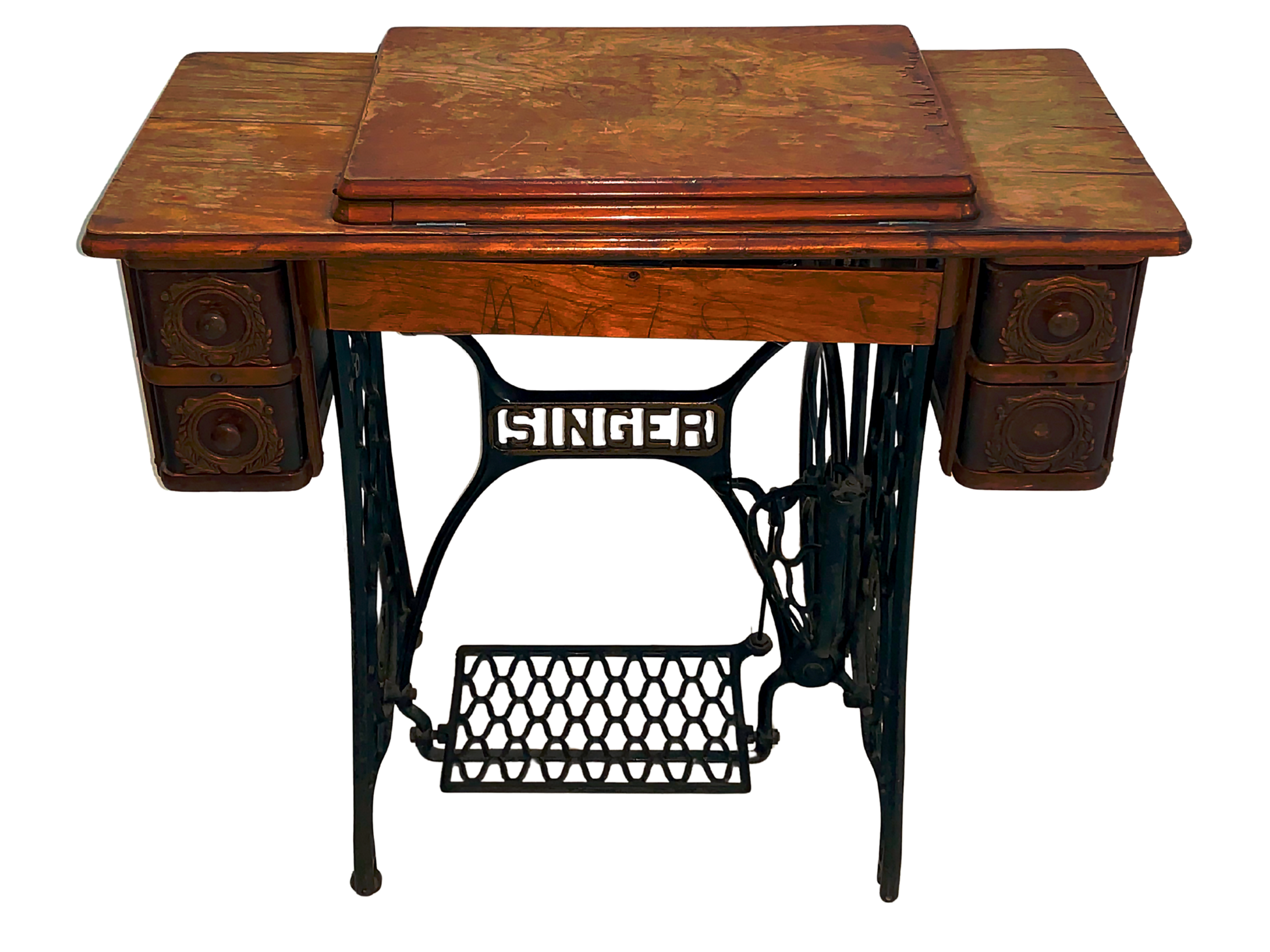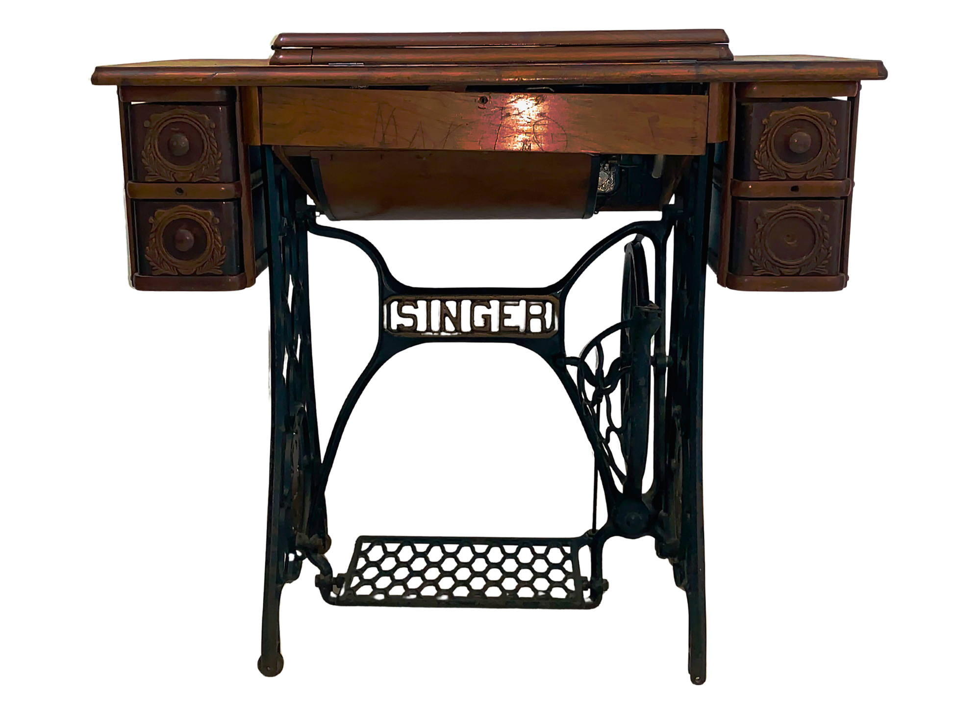Singer, Maquina de Coser, Negro y Marrón, Hierro Fundido y Nogal, USA, 86 cm A x 41 cm P x 77 cm H, 40 - 45 kg. aproximadamente.