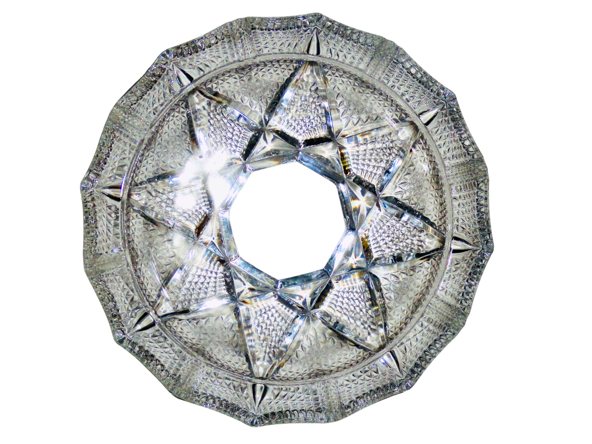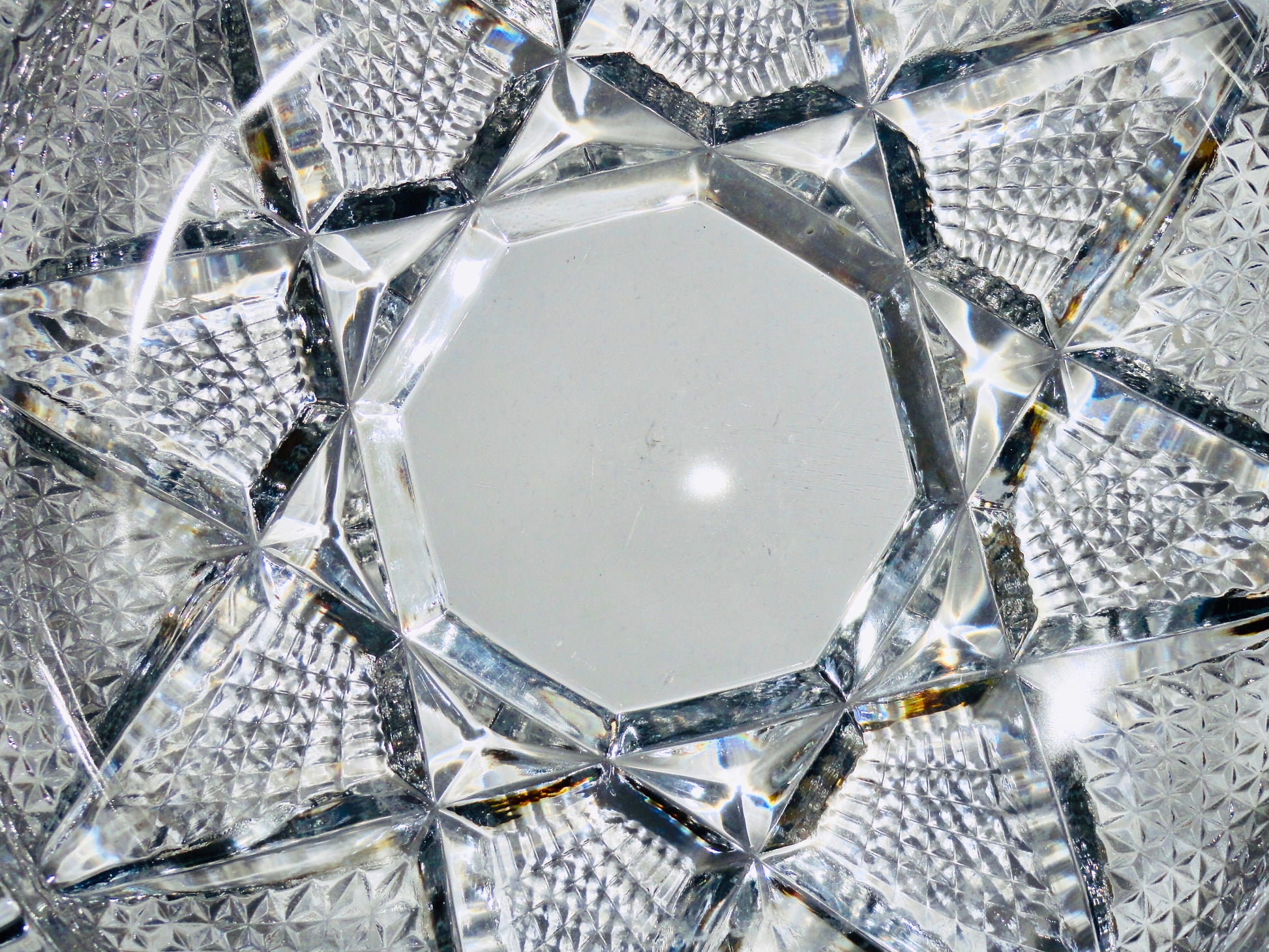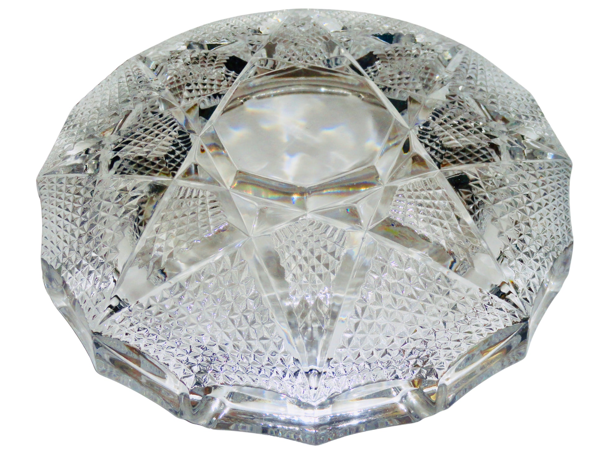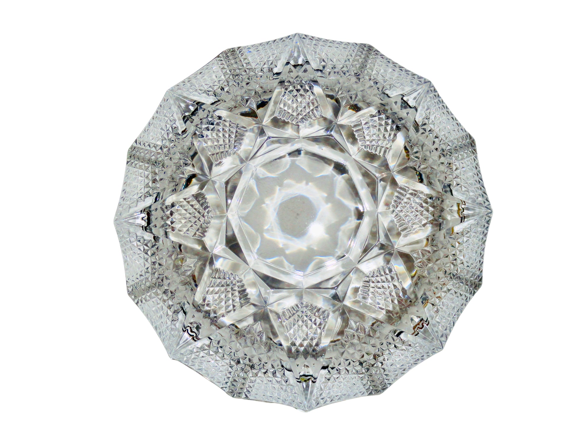 Este elegante cenicero vintage, es una pieza excepcional de vidrio prensado estadounidense, producido entre 1962 y 1998. Presenta un impresionante patrón de estrellas en relieve que crea un efecto visual deslumbrante y reflectante. Con un diámetro de 21,3 cm y una altura de 4,8 cm, este cenicero robusto pesa aproximadamente 1 kg, evidenciando su construcción de vidrio pesado de alta calidad. El diseño geométrico distintivo incluye bordes festoneados y un patrón texturizado que añade carácter y estilo a cualquier espacio. Este ejemplar se encuentra en perfecto estado de conservación, sin astillas, grietas ni opacidad, manteniendo su brillo y claridad originales. Una pieza de colección que combina funcionalidad con el encanto del diseño clásico americano de mediados de siglo.